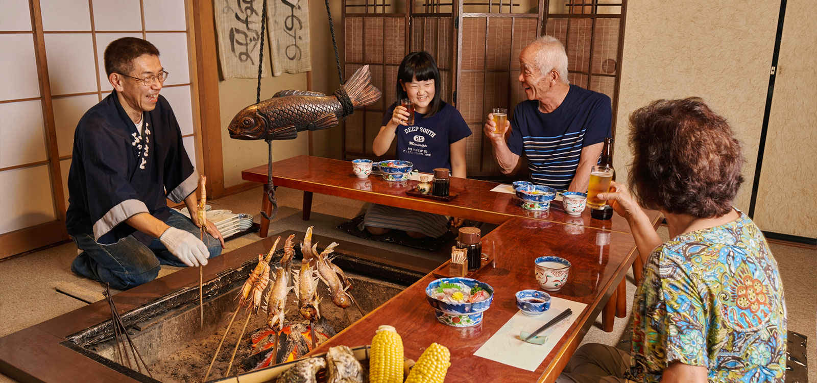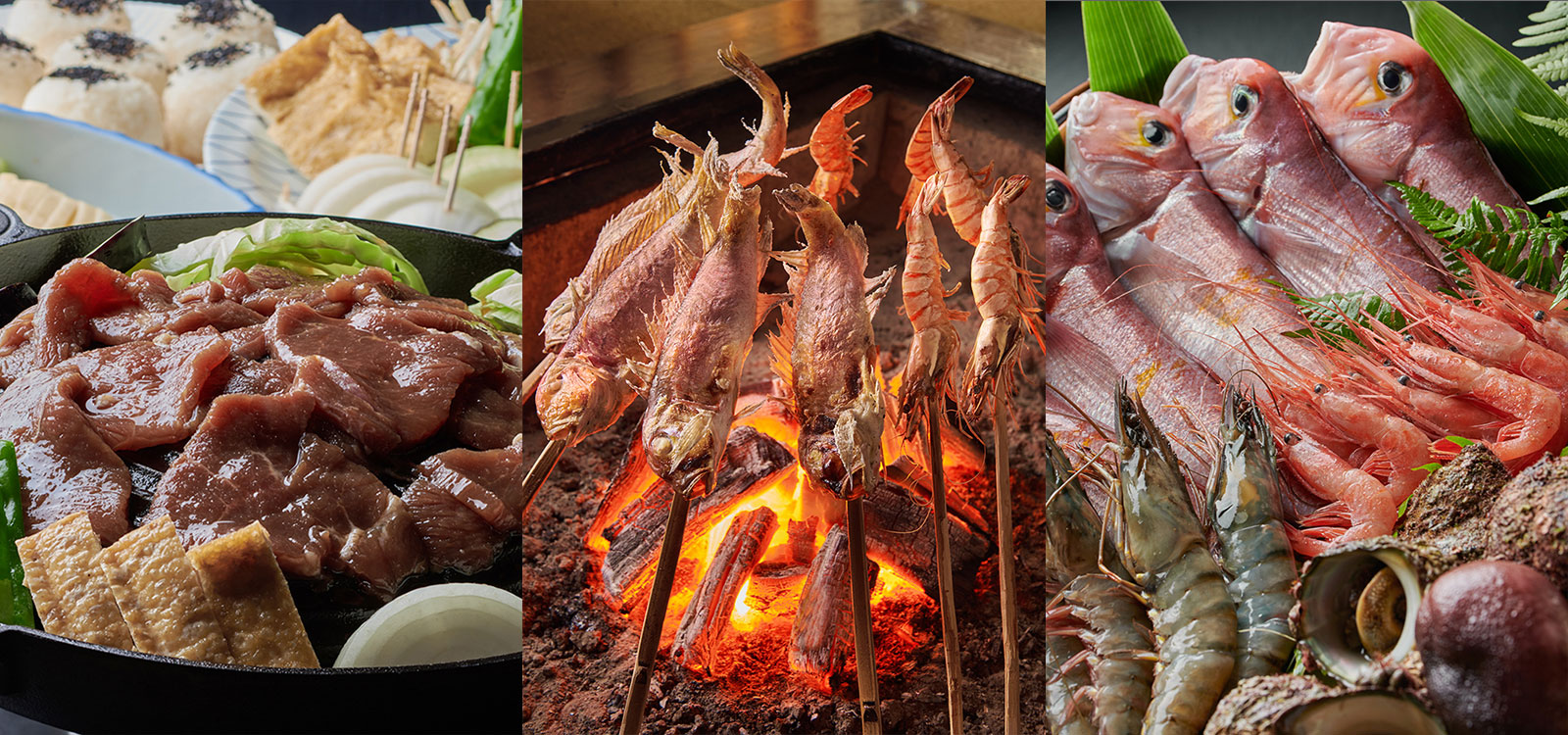能登の新鮮な魚介を味わう日本海の荒波にもまれて育ったいきの良い能登の魚介類。とれたて新鮮な食材を囲炉裏で串にさして炭火で焼き上げた炉端焼きは絶品です。能登の味を存分にご堪能ください。